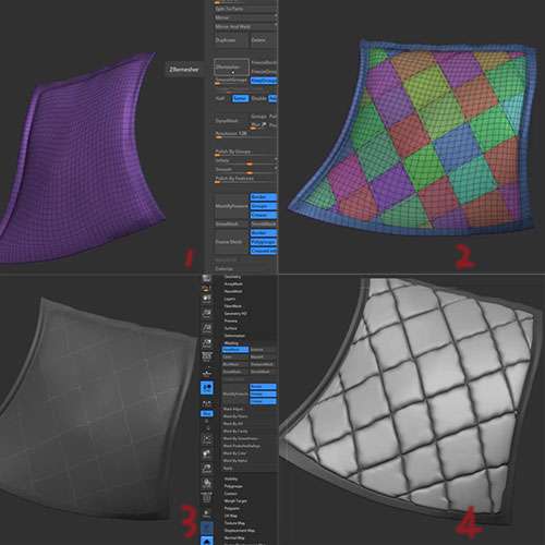 43、动态网格制作靴子雏形并剪切底部再压平制作出靴底,然后再复制靴子并用分组笔刷划分组来制作各个组件,最后再“匹配网格”来制作孔洞的硬边效果 |